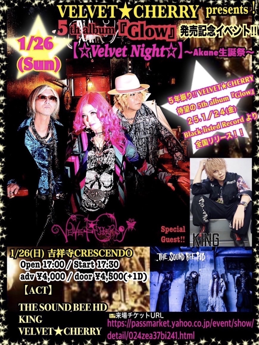 2024 11/10 EDGE Ikebukuro 11/22 浦和ナルシス 2025 01/13 吉祥寺CRESCENDO 01/26 吉祥寺CRESCENDO THE SOUND BEE HD LIVE2024年11月10日(日)EDGE Ikebukuro FORBIDDEN 新音源リリース記念主催公演 「FORBIDDEN CITY Vol.3」 [OPEN/START]17:00 / 17:30 [FERBIDDEN VIP TICKET] ¥8,000+D [ADV/DOOR]¥4,500+D / ¥5,000+D [ACT] [入場順] [チケット情報] ■受付 URL 2024年11月22日(金)浦和ナルシス THE SOUND BEE HD主催 『Death parade 2024.11.22』 open 17:30 start 18:00 前売¥3,500(当日¥4,000) +1drink¥600 THE SOUND BEE HD [チケット取扱] ※入場は整列順 THE SOUND BEE HD メールチケット予約 当日昼まで受付: 配信あり:【ご来場の方!!会場と配信のセット割:\1500OFF!】 2025年01月13日(月祝) 吉祥寺クレッシェンド 「断頭台のメロディー presents Guillotine Sound Fes' 250113」 出演:断頭台のメロディー / Amiliyah / THE SOUND BEE HD / W.A.R.P / 怪人サリー ◆来場チケ(※webチケ&各バンド予約併用) 前売 3000円+D(※11/15金の20:00〜発売) 当日 3500円+D ◆配信 2500円 ◆投げ銭(※1/1〜受付開始) 2025年01月26日(日) 吉祥寺CRESCENDO VELVET★CHERRY presents! 5th album『Glow』発売記念イベント!! 【☆Velvet Night☆】〜Akane生誕祭〜 Open 17:00 / Start 17:30 前売り¥4,000 / 当日 ¥4,500(+1D) [Special Guest] ●チケット● 2024.11.1 22:00〜 |